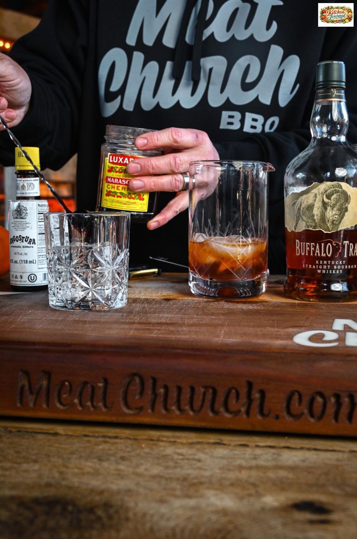 Add in a luxardo cherry for garnish. Express an orange peel around the rim and garnish with it.