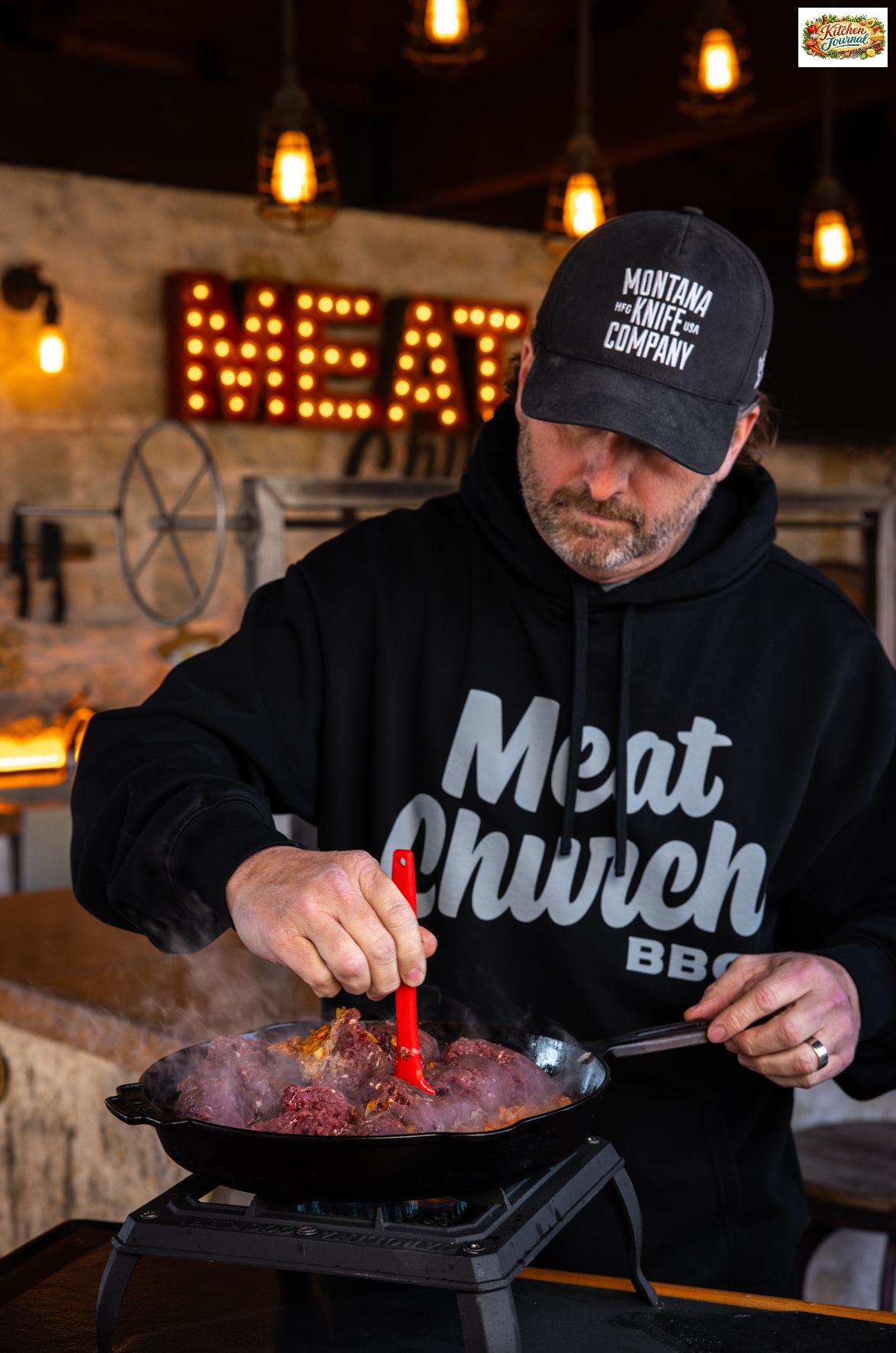 Stir in the ground meat and season with Meat Church Holy Cow. Cook until browned which will take 6 - 7 minutes.
